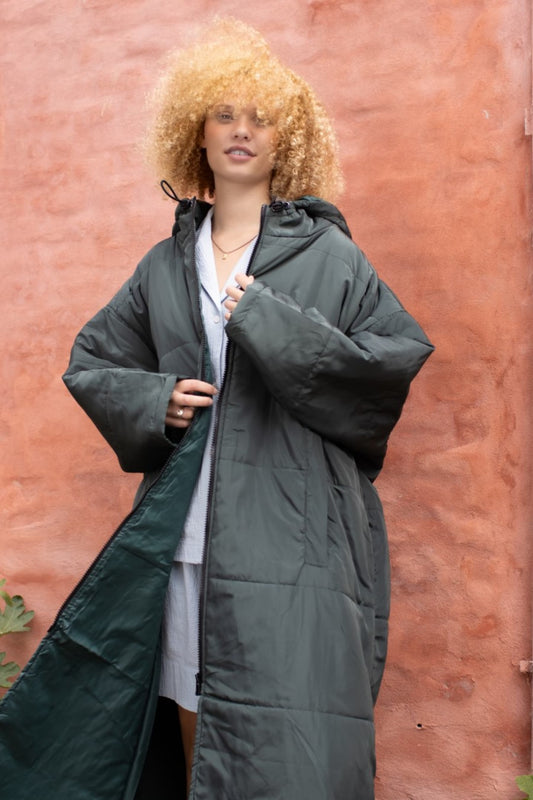 Sittingsuits are wearable blankets, big enough to fit over your coat but warm enough to wear as a coat itself! They are cosy yet lightweight and ideal for warming up after a cold swim or keeping warrm and dry on a dog walk.