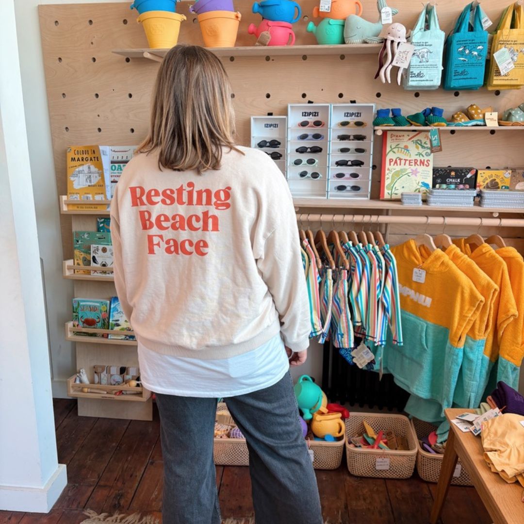 Hand screen printed in the UK, it features our now-iconic Resting Beach Face slogan loud and proud across the back, with the Harbour & Tide logo (complete with Margate underneath) on the chest—a wearable nod to our little neighbourhood beach store.